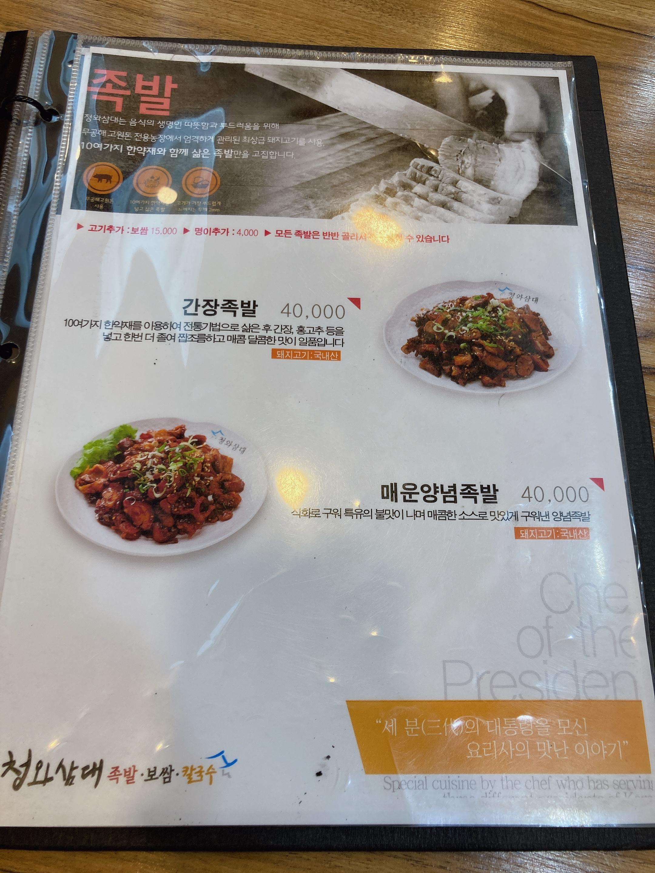 청와삼대가 자랑하는 요리는 족발, 보쌈, 그리고 칼국수입니다.