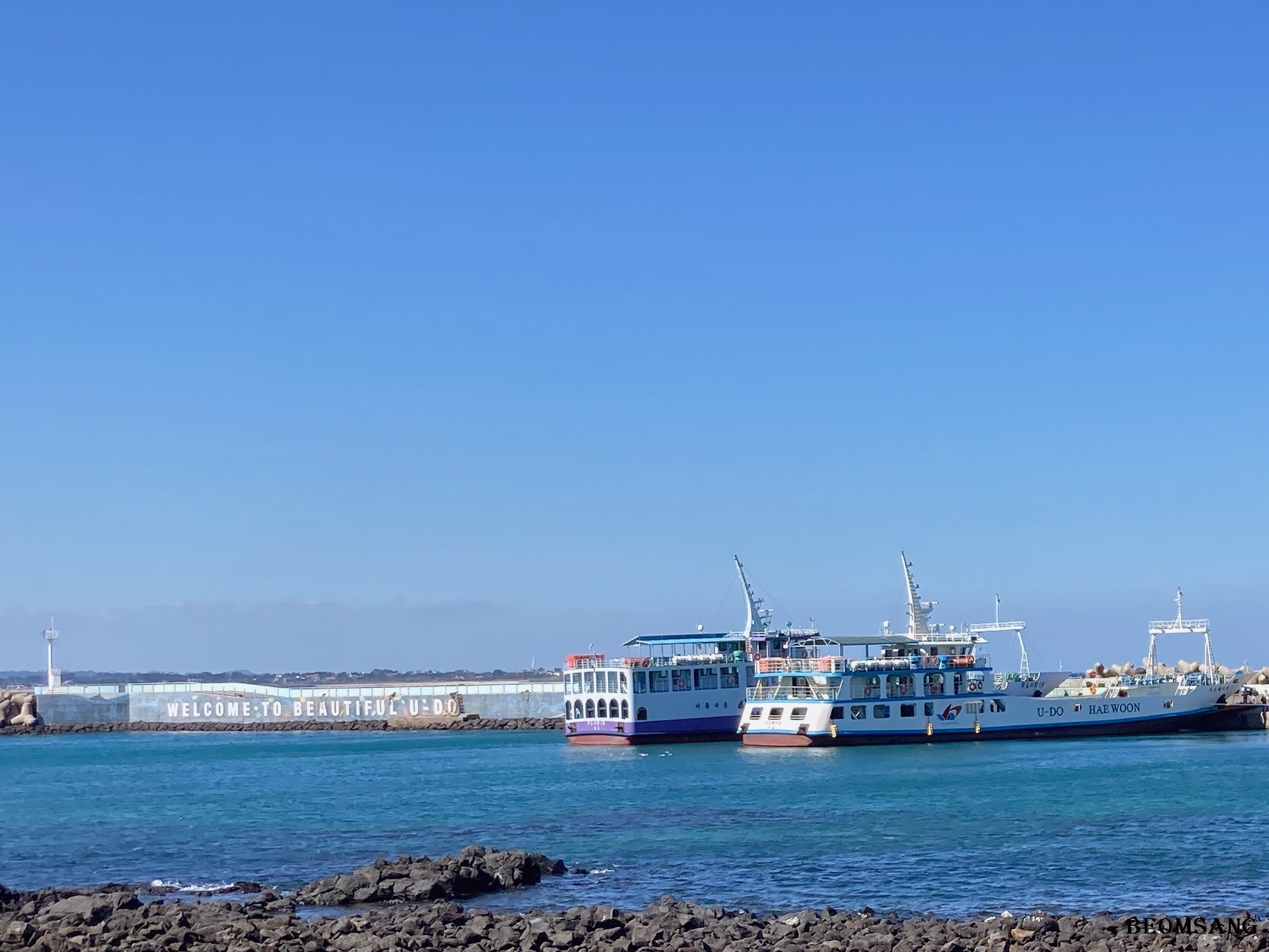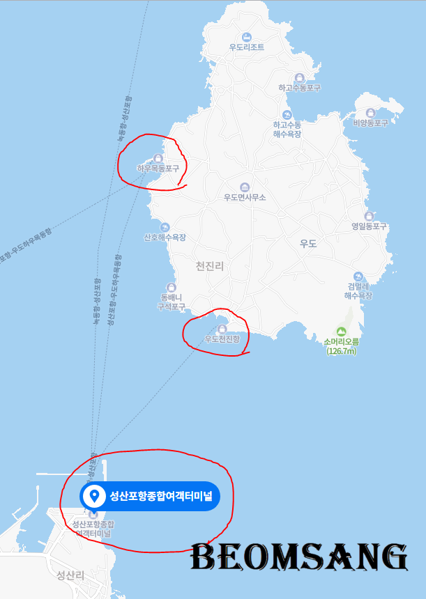 출발하는 길은 성산포항종합여객터미널을 찾으시면 되고, 우도천진항 또는 하우목동항(하우목동포구)으로 향합니다.